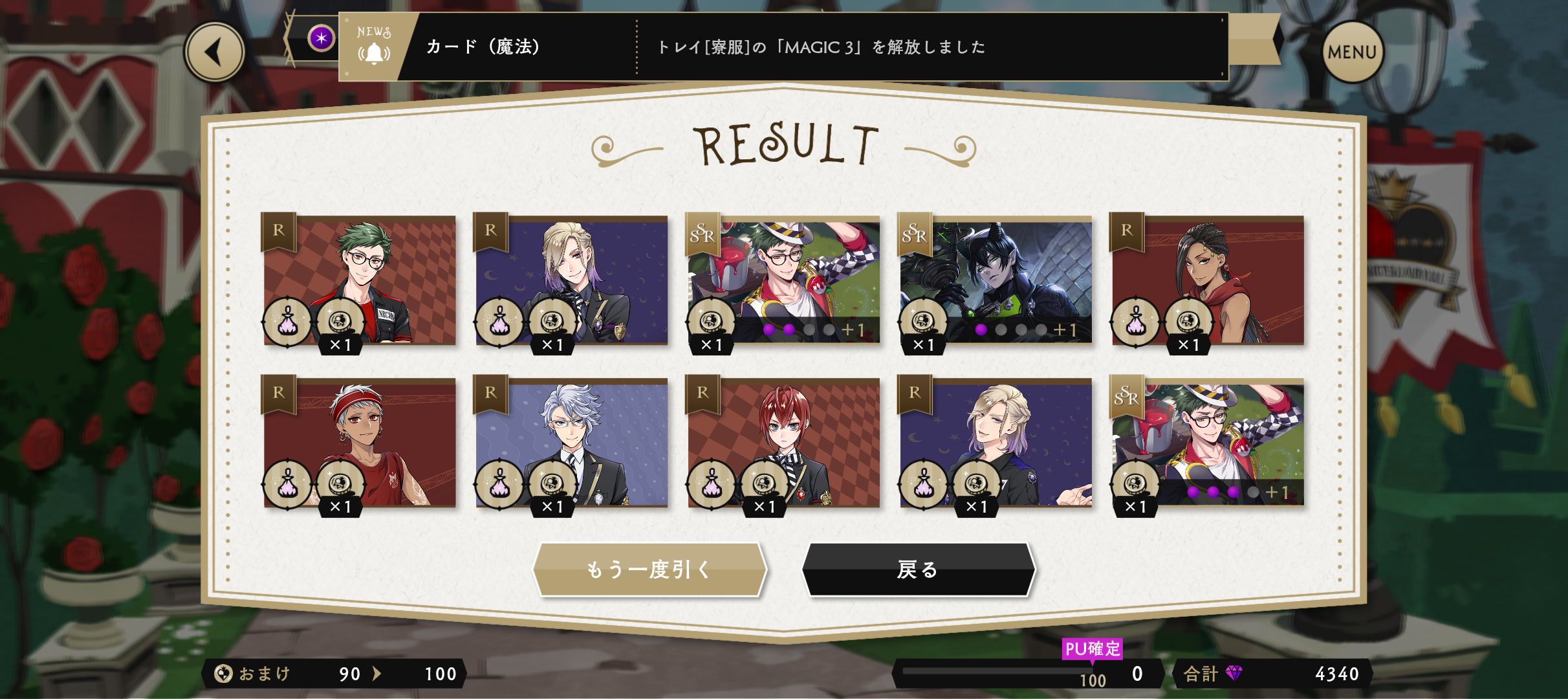 ・ガチャ1回回すと1枚貰えるメダルがあり、100枚(100連分)で任意のハーツ寮服SSRと交換可能