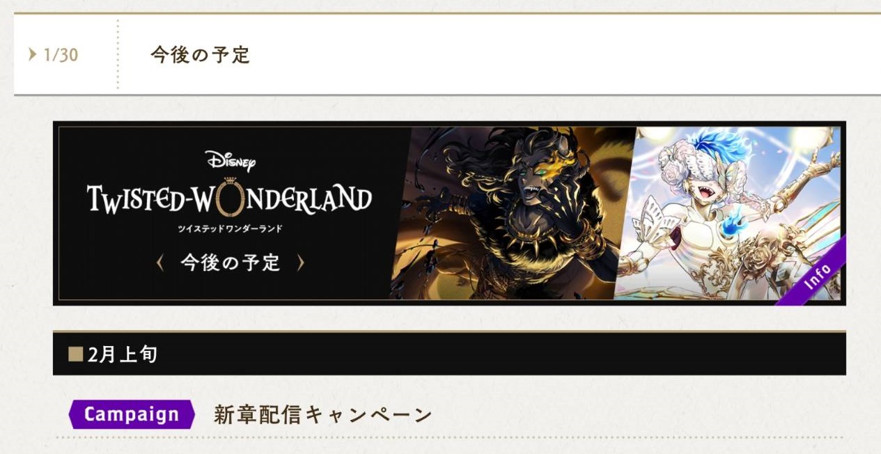 最新情報 【ツイステ】2月下旬までの予定表 コメント0 2026.01.30 最新情報 【2月上旬】 ・復刻イベント「フェアリーガラIF」 ・ケイト バースデー 【2月下旬】 ・SSRレオナ[荒野の反逆者]召喚 ・アズール バースデー ・NRC統一試験
